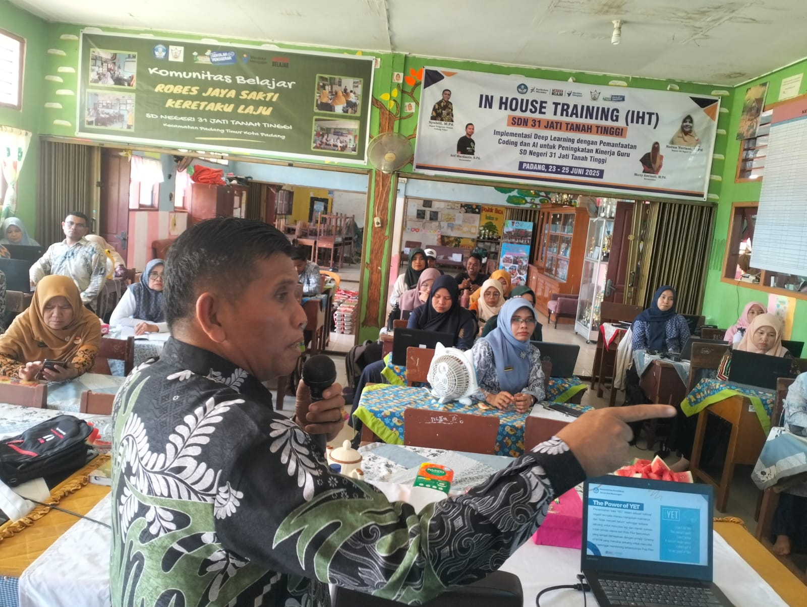 Melengkapi materi teknis tentang projek, narasumber kedua, Bapak Syahril, M.Pd., membawa materi yang menyentuh aspek fundamental dari profesi seorang pendidik, yaitu tentang perubahan pola pikir atau mindset. Beliau memaparkan materi mengenai transformasi dari pola pikir tetap (fixed mindset) menjadi pola pikir bertumbuh (growth mindset). Menurut Bapak Syahril, tantangan pendidikan di masa depan mustahil bisa dijawab jika guru masih bertahan pada pola-pola lama yang kaku. Seorang guru dengan pola pikir bertumbuh akan melihat tantangan sebagai peluang, kegagalan sebagai sarana belajar, dan keberhasilan orang lain sebagai inspirasi. Sesi ini berjalan sangat interaktif karena para guru diajak untuk merefleksikan diri tentang bagaimana cara mereka menanggapi kesulitan siswa di kelas. Transformasi mental ini menjadi fondasi penting agar tema “Tutor Aktif” dalam IHT ini benar-benar terwujud dalam keseharian mengajar di SD Negeri 31 Jati Tanah Tinggi.